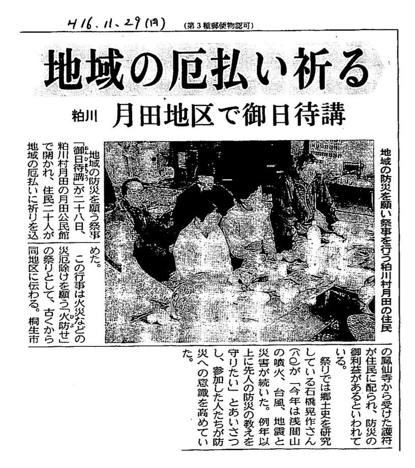 地域の厄払い祈る 粕川月田地区で御日待講地域の防災を願い祭事を行う粕川村月田の住民を願う祭事平成16年11月29日 上毛新聞 |