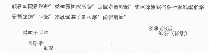 この書状は永平寺が羽柴秀治に青銅一〇〇疋を送ったことに対する秀治の礼状である。この礼状の中に「将又従関東永平寺後席長老被相越侯旨、尤候」と、関東から後席の長老が来ることをすでに承知していることが述べられている。しかも、「尤候」とあって、そのことが妥当なことであると述べていることに留意したい。秀治のような領主の目にさえ、水平寺が関東から後席の長老を迎えるということが妥当なこととして受けとられていたのである。羽柴秀治とは堀氏のことで堀秀政の子である。父秀政が天正一七年五月二七日、小田原攻めの時、早川口というところで戦死している。