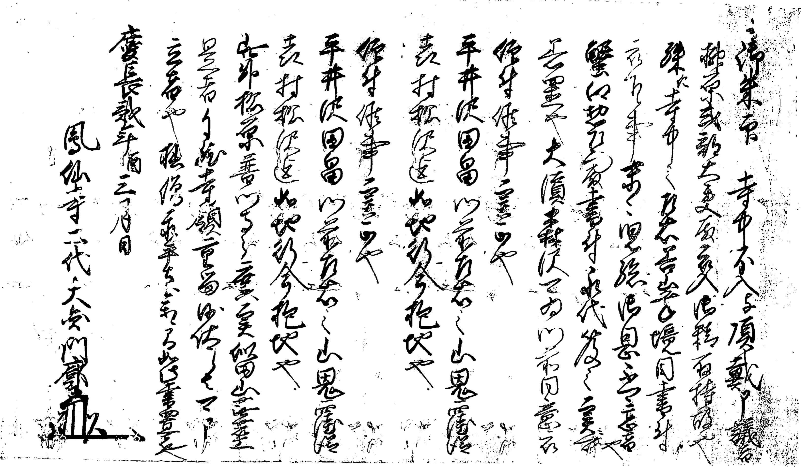 最後の文言に「拙僧永平寺へ参候間」とあることから、門鶴(このころは「門廓」)が永平寺に赴くに際しての「置文」であることが知られる。また、この「置文」を作成した慶長二年三月の時点では、永平寺に赴くことは、すでに決定していたが、いまだ鳳仙寺にいたことも知ることができる。門鶴は鳳仙寺の三世であった。このことから考えて、さきの「羽柴秀治書状」は慶長二年の五月一九日のことであろう。