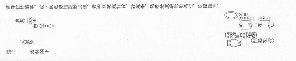 祚玖(球)が署名しているので、慶長三年八月二八日当時においては、住持であることが知られる。しかし、この文書は「大圓」「門廓」という印文を持った判と門鶴の花押もある。これらが、祚玖(球)の署名と同時に行なわれたのか、のちに、現世に登山した折に、あらためて、すでに現住となっていた門鶴から印・花押を受けたのかは不明であるが、門鶴の方は印と花押のみで署名しておらず、その位置も、不自然な所にあり、文書を発したのは祚玖(球)のみであった、とみてよかろう。いずれにしても、住持が交替する時期の「請状」であったことを物語っている。