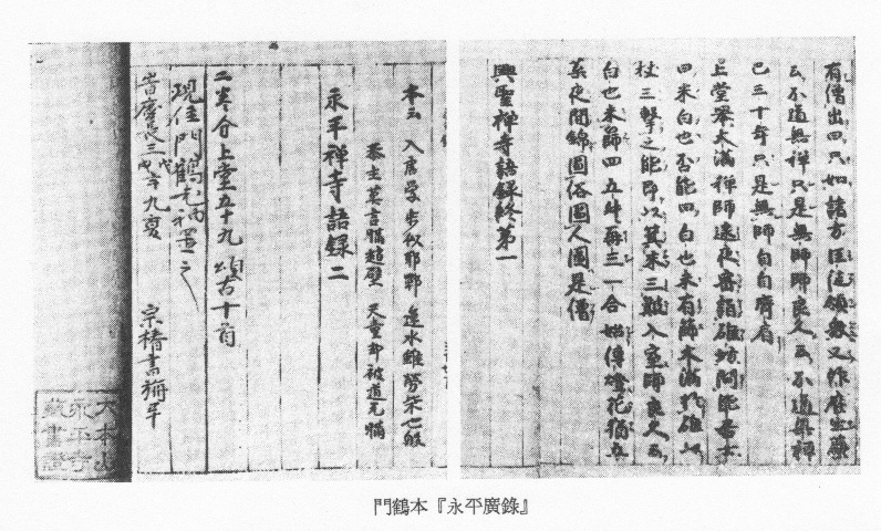 道元禅師の語録には『廣録』と『略録』と通称されるものがある。『略録』は、すでに述べたように寒巌義尹が文永元年(一二六四)に入宋し、無外義遠に請い、『廣録』の中から適意のものを抄出してもらったものである。この『略録』は延文三年(一三五八)に永平寺曇希が越前大野宝慶寺の檀越である伊治良知冬の援助を受けて、開板されている。しかし、『略録』に比べれば10倍以上の分量を収めている『永平廣録』の開板は、ずっと遅れる。江戸期に入って寛文一二年(一六七二)に卍山道白が出版するに至るまで、ついにみることができなかったのである。したがって、卍山の開板に先立つこと七四年という時期での書写であるだけに、その意義は一層高いものがある。しかも、『卍山本』と所々に相異をみせており、『永平廣録』諸本の存在を示している。なお、『卍山本』には「坐禅箴」が収録されているが、これは『延文本』からの影響と考えられている。また、この『門鶴本』の写本が栃木県日光輪王寺の慈眼堂に所蔵されている。同本の所々には語録の読み方が記入されており、室町時代に、種々の漢語・禅語がどのように読まれていたのかを示している。