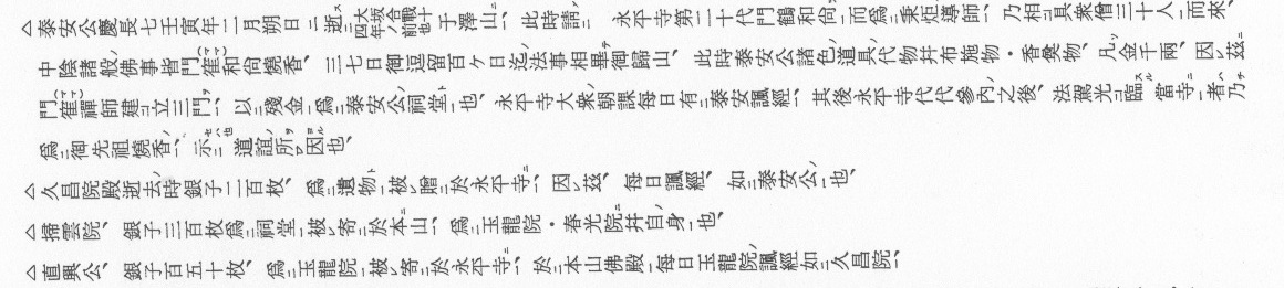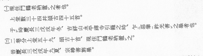 この外の第三巻から第一〇巻の識語には、各巻ごとの上堂法語と頌古の記載数しか書かれていない。さて、??の識語をみるに、この『永平廣録』が、当時の住持である門鶴の意志により書写され、永平寺に置かれるごとになったことが知られる。しかし、直接に書写の仕事をしたのは、第一巻では祚光、第二巻では宗椿である。この二人は、門鶴の命によって、この仕事に就いたに相違ない。第三巻以降を書写した人物は不明であるが、とくに識語に書かれてないところをみると、この二人が書写したものであろう。