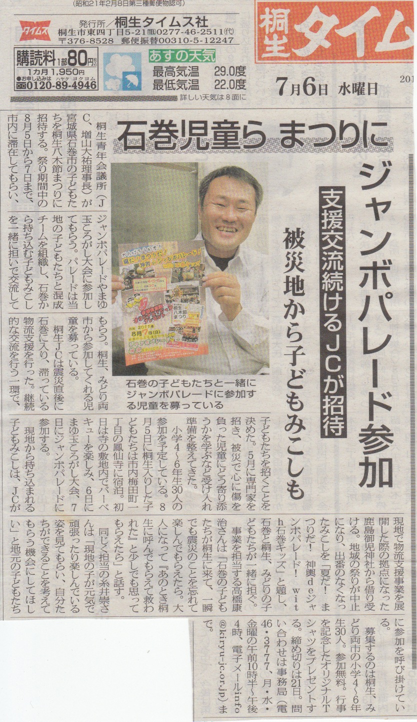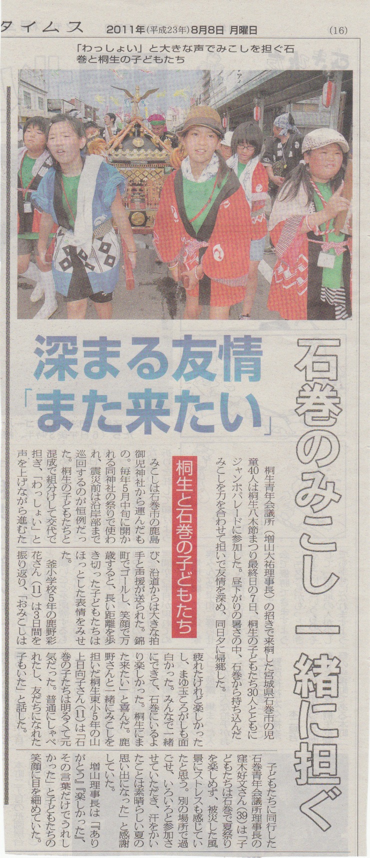 石巻児童ら祭りに ようこそ桐生へ 石巻のみこし一緒にかつぐ