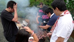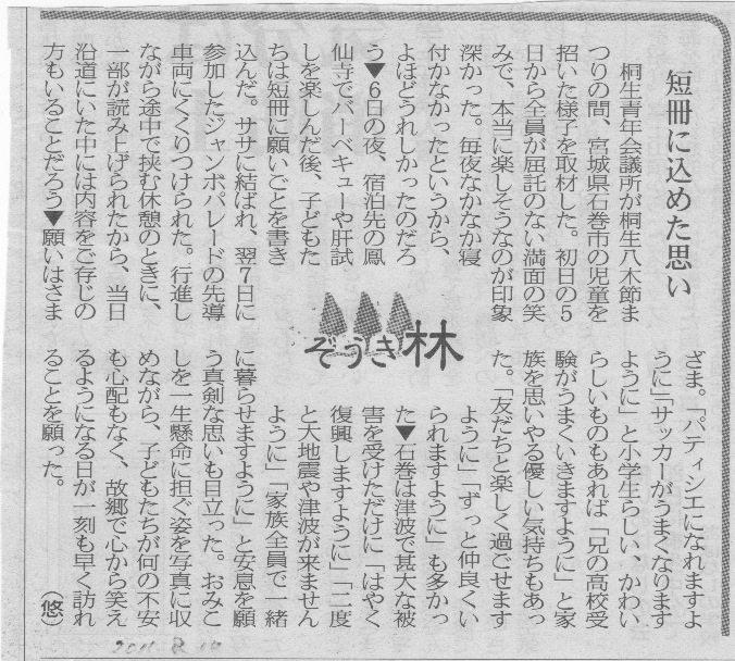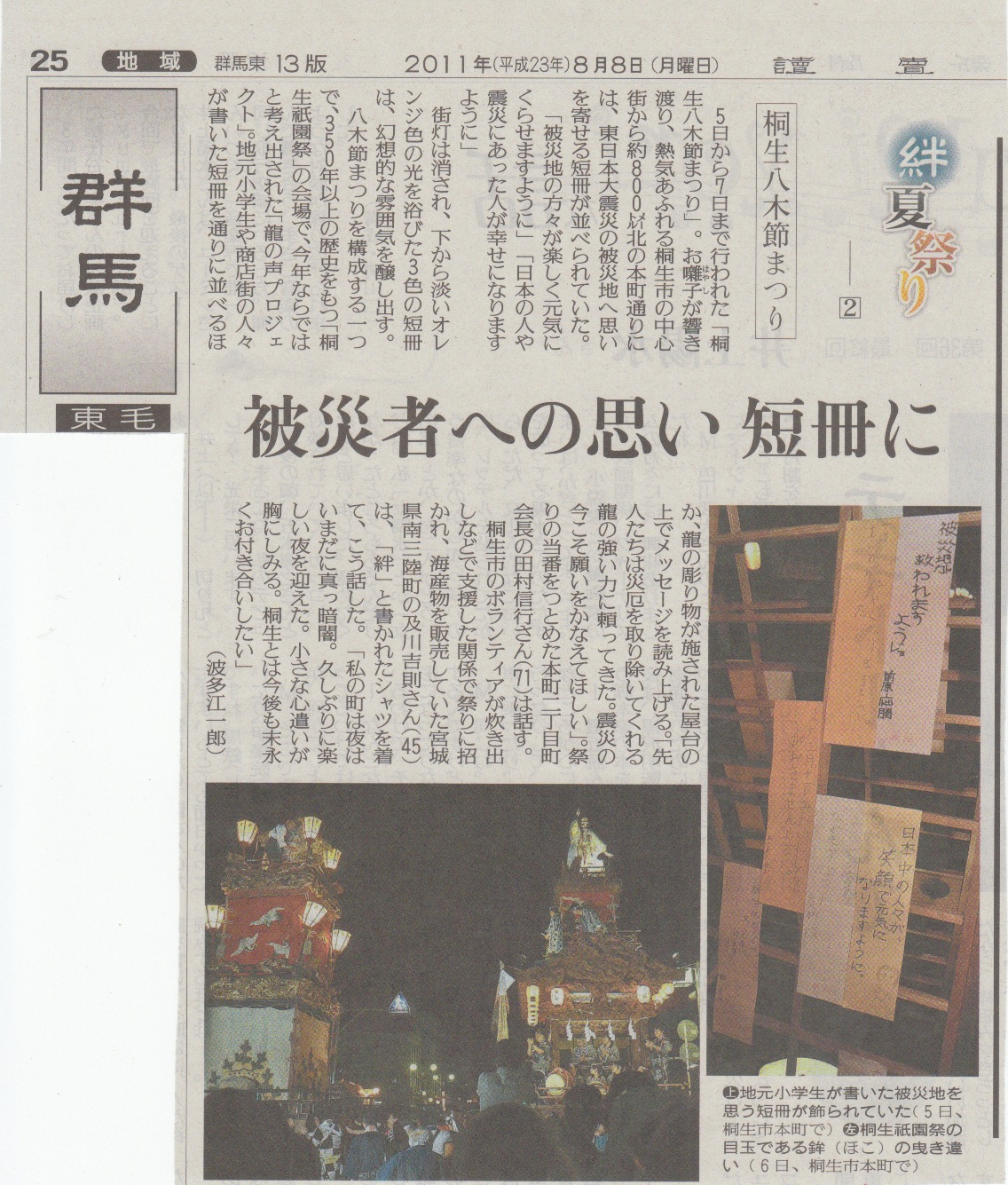 石巻児童ら祭りに ようこそ桐生へ 石巻のみこし一緒にかつぐ 被災者の思い短冊に 短冊にこめた思 い