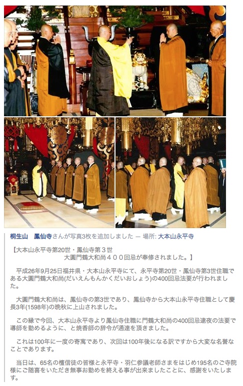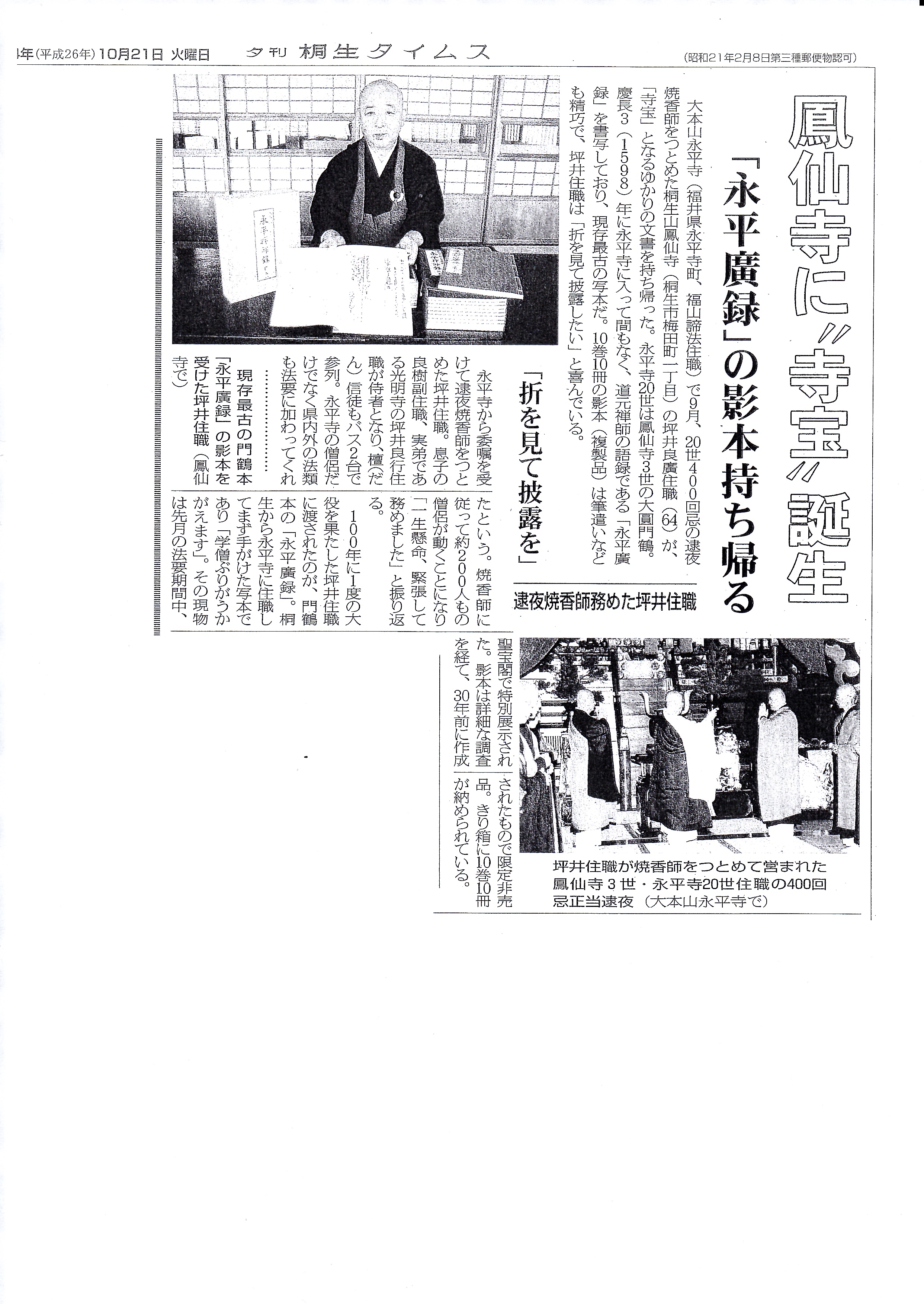 桐生山鳳仙寺(坪井良廣住職(64)が9月24日、大本山永平寺(福井県永平寺町、福井諦法住職)で行われる20世400回忌の逮夜焼香師をつとめることになった。永平寺20世住職の大圓門鶴は鳳仙寺3世住職で、慶長3(1598)年に永平寺に入ったことが各寺に伝わる文書からわかっている。永平寺から委嘱を受けた坪井住職は「たいへん名誉な
